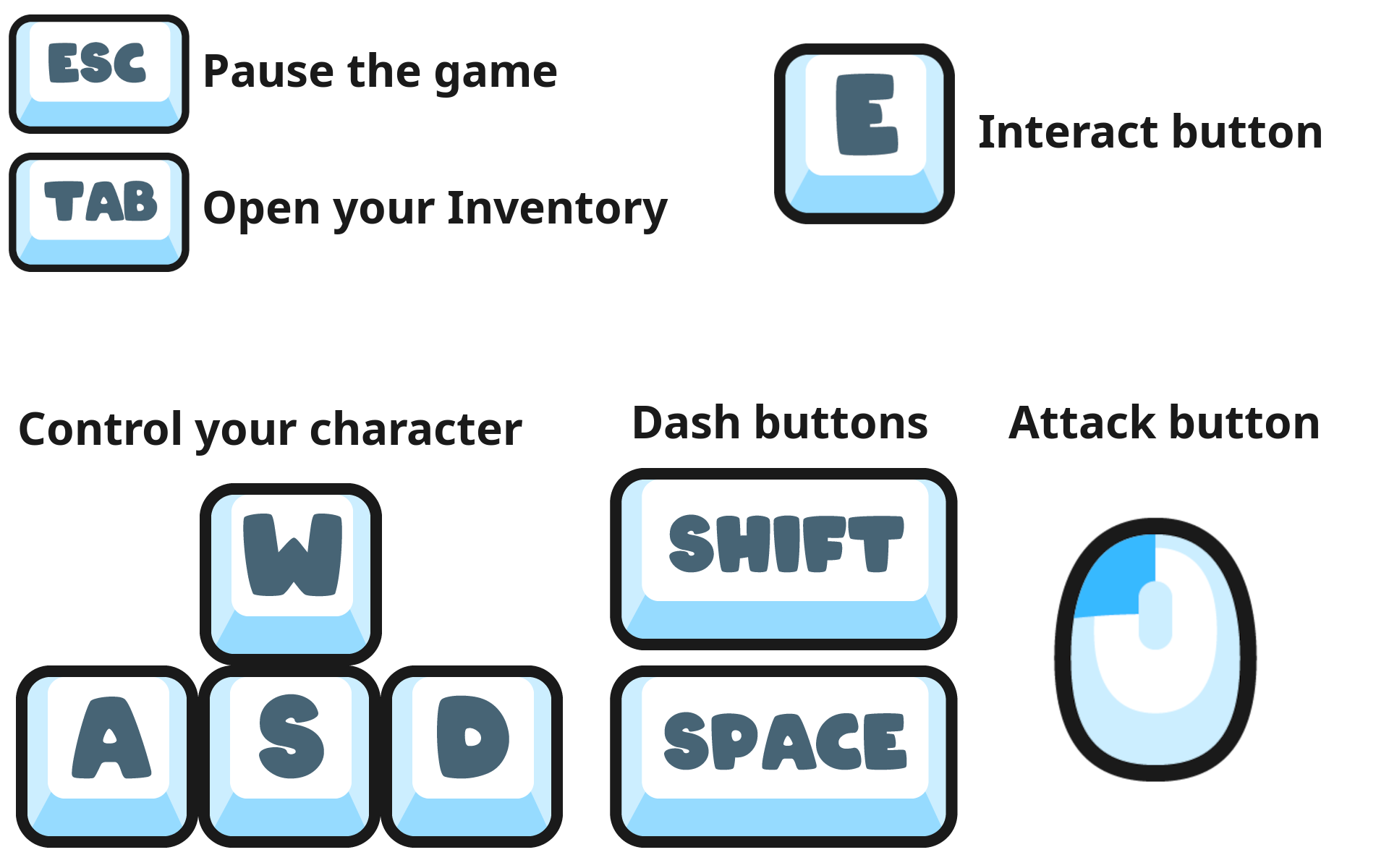 Image representing the keys used to play. Esc to Pause, Tab to see the inventory, E to interact, WASD to move your character, Shift & Spacebar to Dash and Mouse left click to attack.Credits :